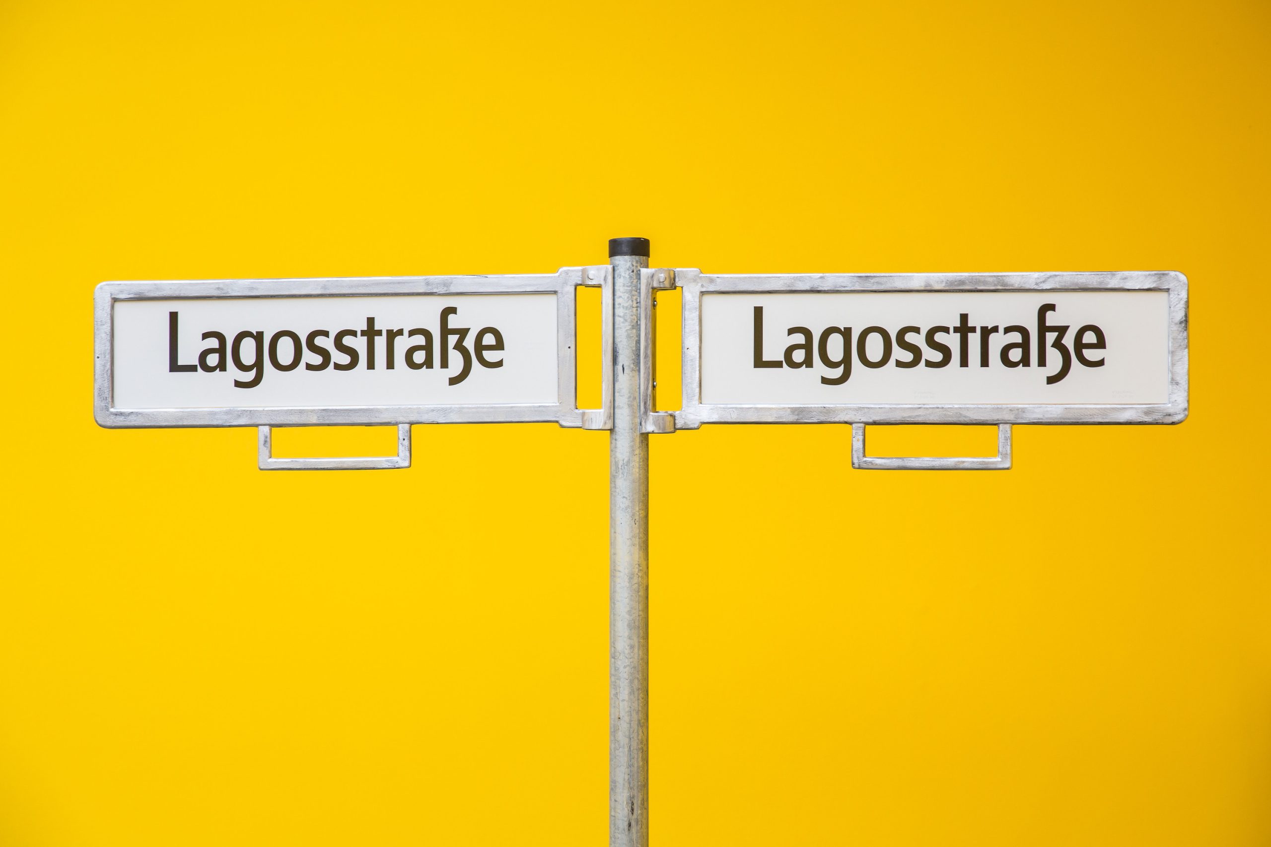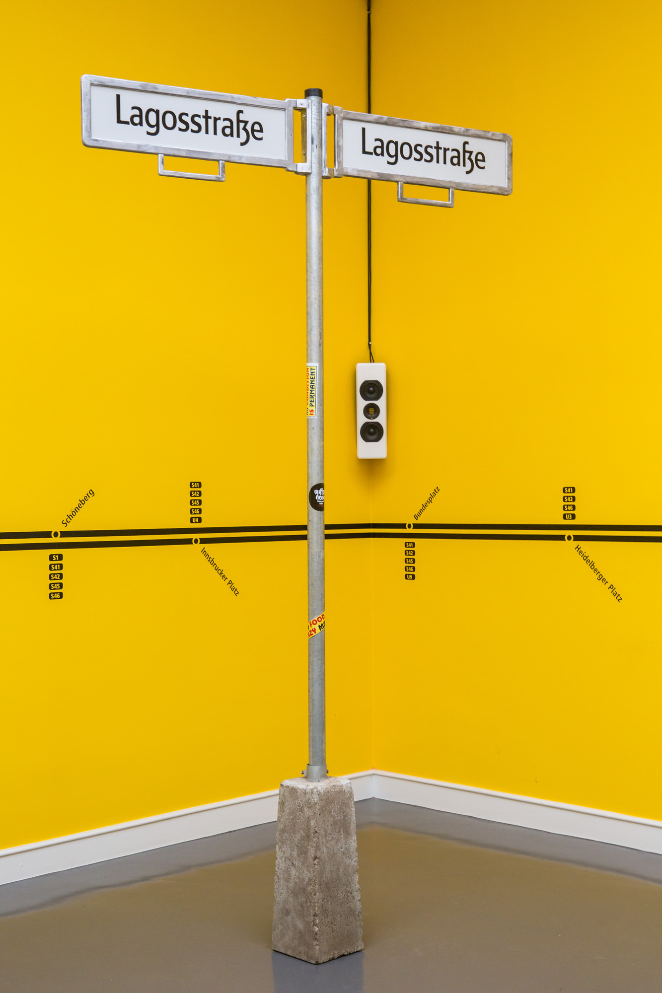 A solitary signpost and a Berlin U-Bahn station sign punctuate the space, translating Lagos landmarks into a German context—Obalendeplatz, Lagosstrasse. Together, these elements invite viewers to encounter Lagos through Berlin, and Berlin through Lagos.