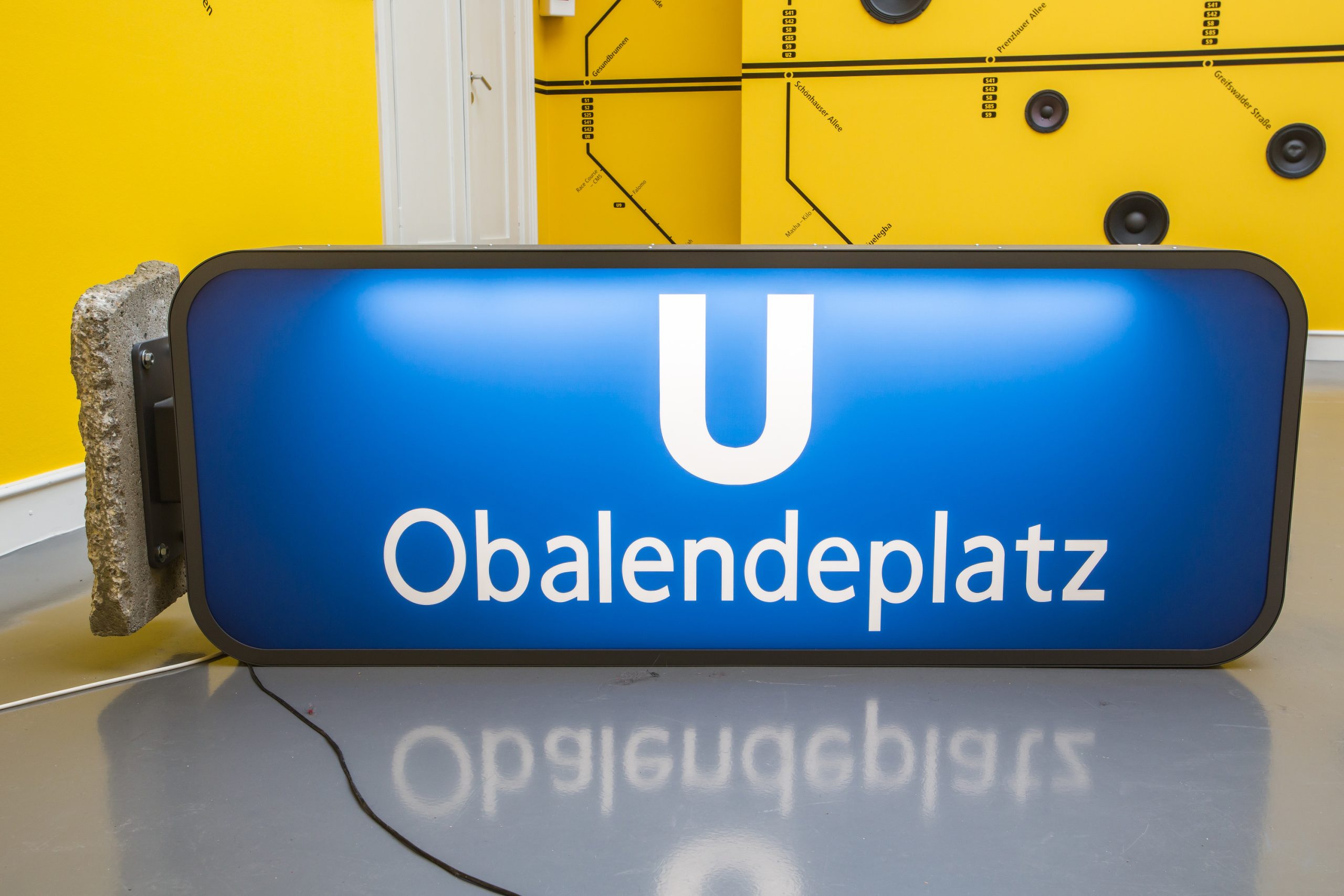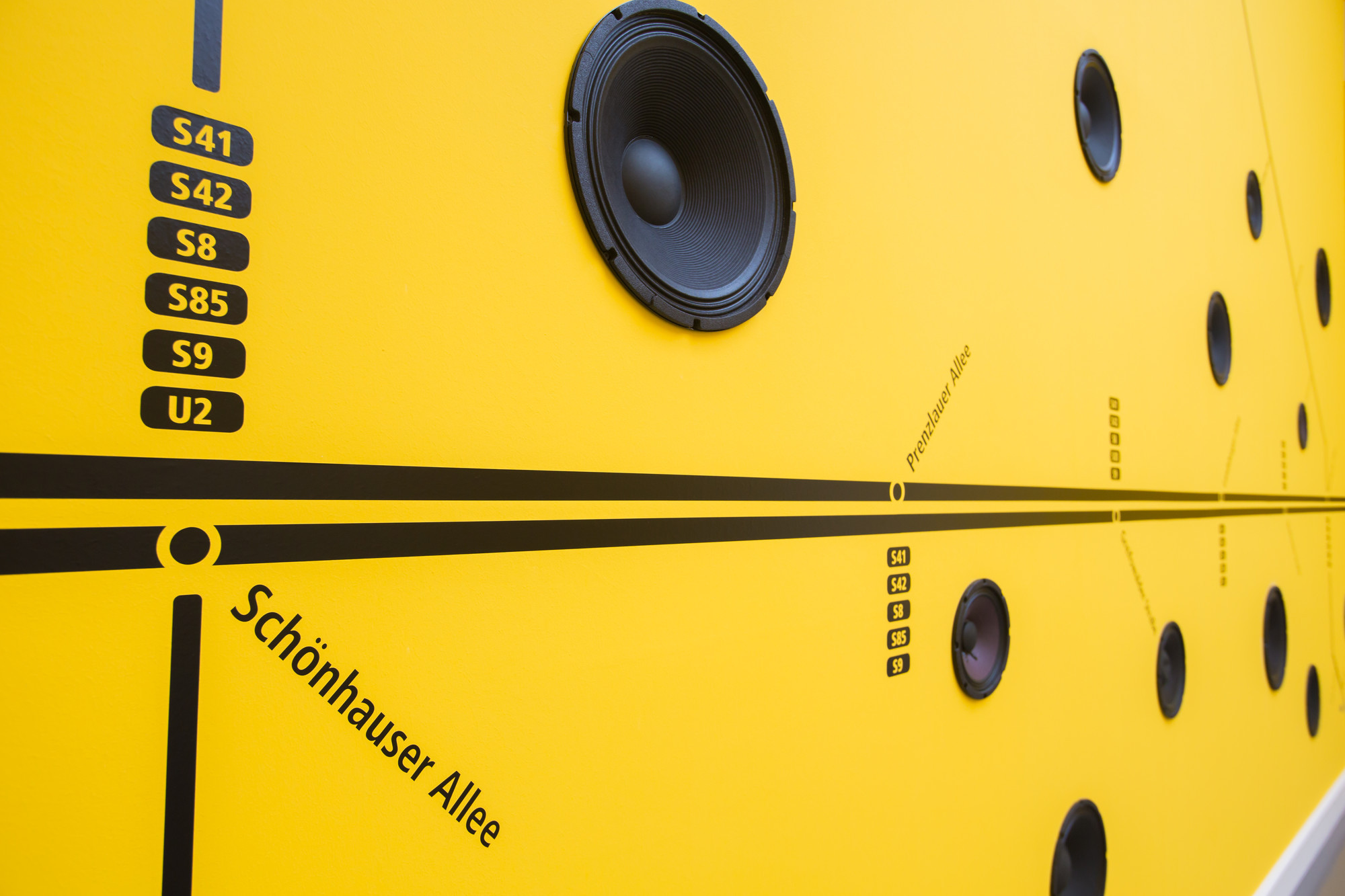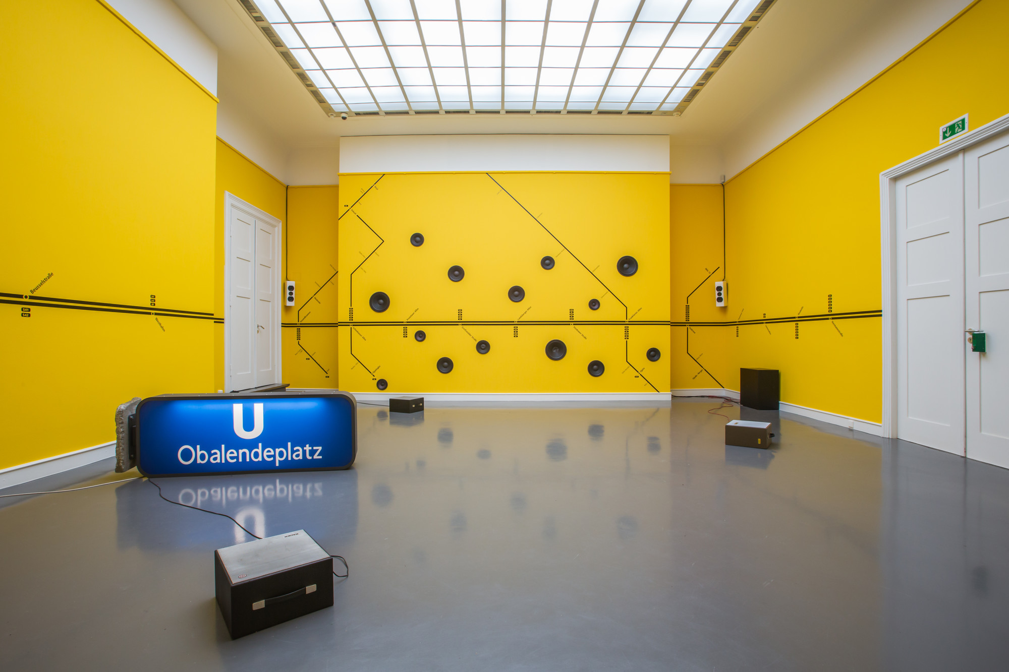 • Medium : 18-channel sound installation, painted wall, galvanized steel and aluminum street sign, U-Bahn metro sign, concrete slab, vinyl wall graphic.
