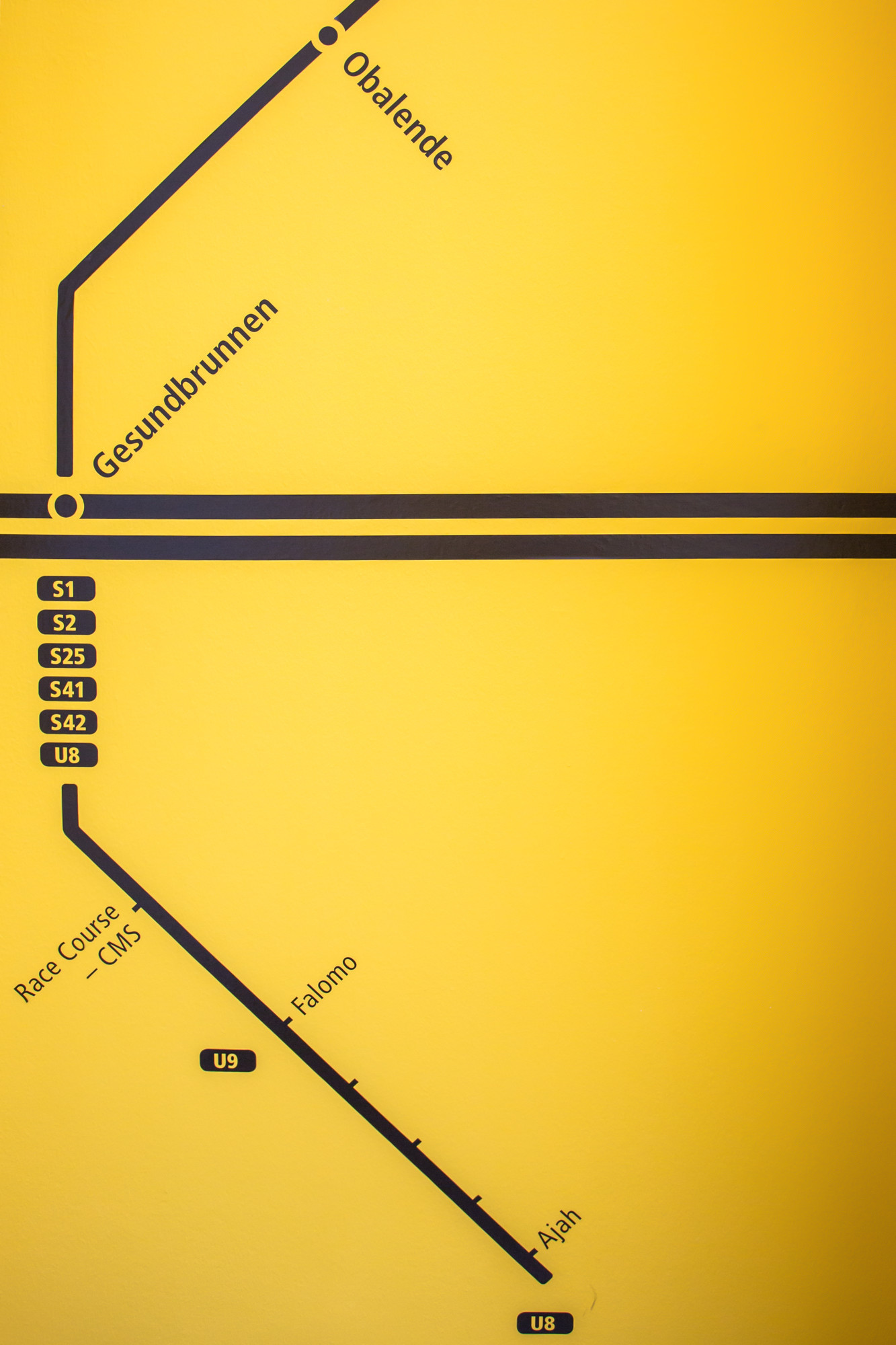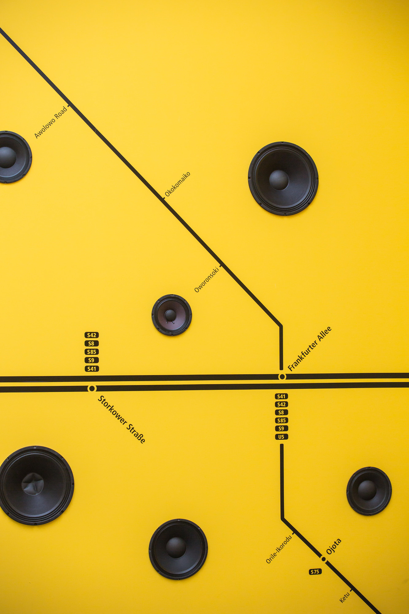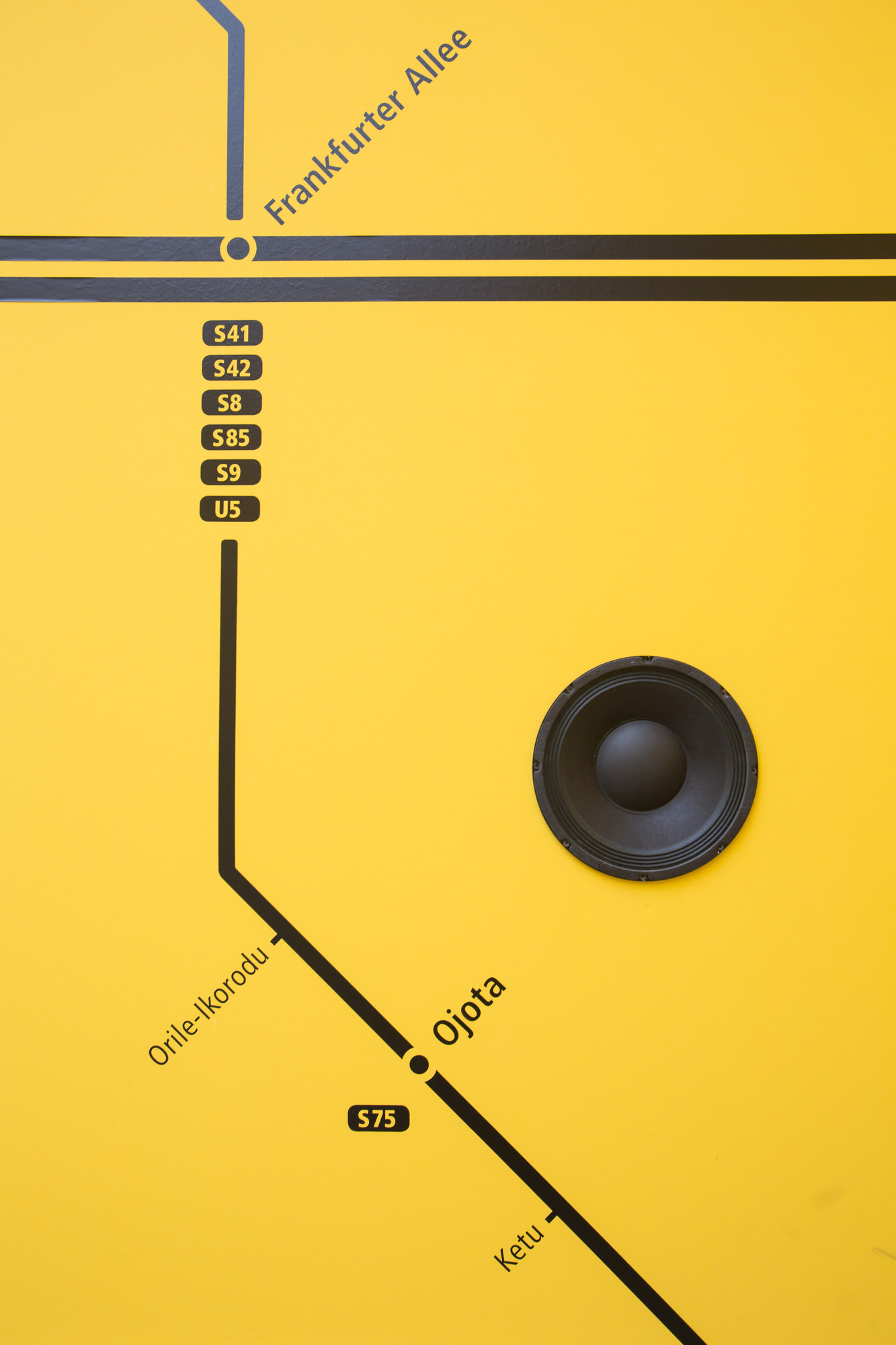 The exhibition space is defined by cadmium-yellow walls encircled by two black horizontal stripes—visual references to public transport systems that structure daily life in both cities. In Lagos, the stripes recall the iconic Danfo buses; in Berlin, they evoke the U-Bahn and the circular logic of its transit network. Reimagined by Ogboh, Berlin’s ring route is symbolically extended to include key Lagos bus terminals, collapsing geographic distance and expanding ideas of home and belonging.